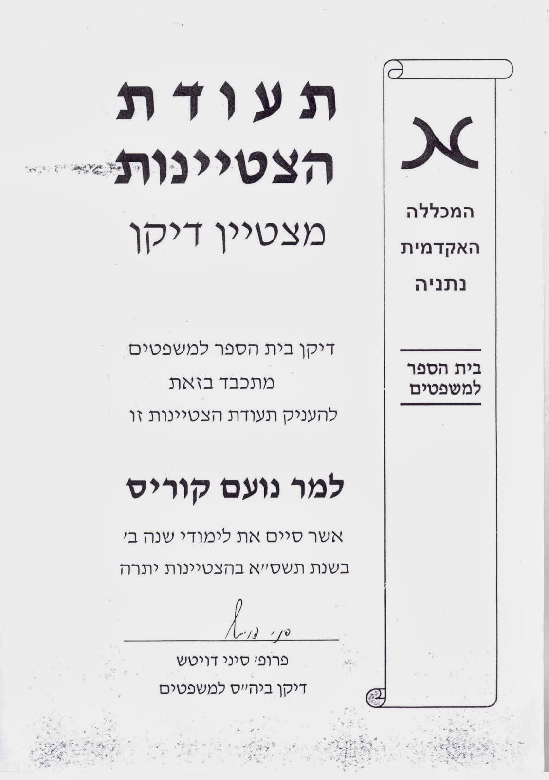 - עו"ד נועם קוריס - תעודת הצטיינות